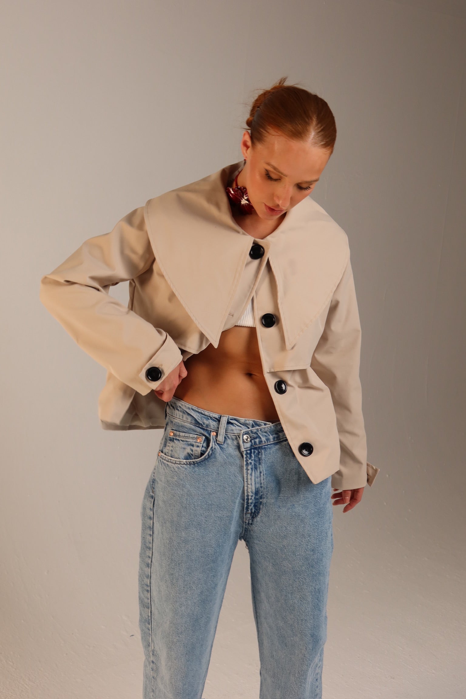 A timeless classic, the Capeline Trench Coat is designed with a structured silhouette and a distinctive capeline overlay. Crafted to elevate everyday looks, this cropped trench-style jacket features statement buttons, tailored sleeves, and a flattering fit that transitions seamlessly from mornings at the office to dinner date nights.